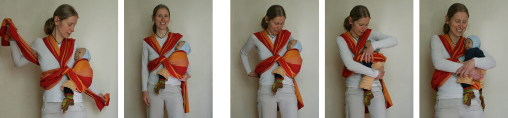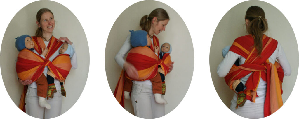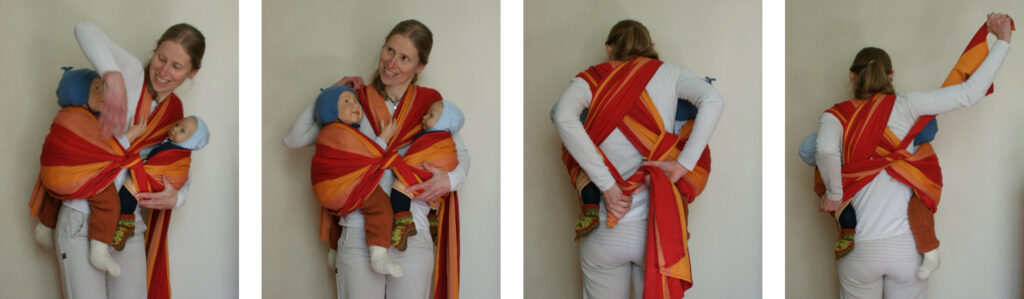 Das Hineinsetzen der Kinder funktioniert anfangs wie bei der Hüftschlinge mit einem Ring und wird dann wie bei der Schmetterlingstrage mit dem umgenähten Tragetuch vollendet (siehe mittleres Foto und zweites Foto von rechts), einschließlich des Verknotens der Tuchenden auf dem Rücken.