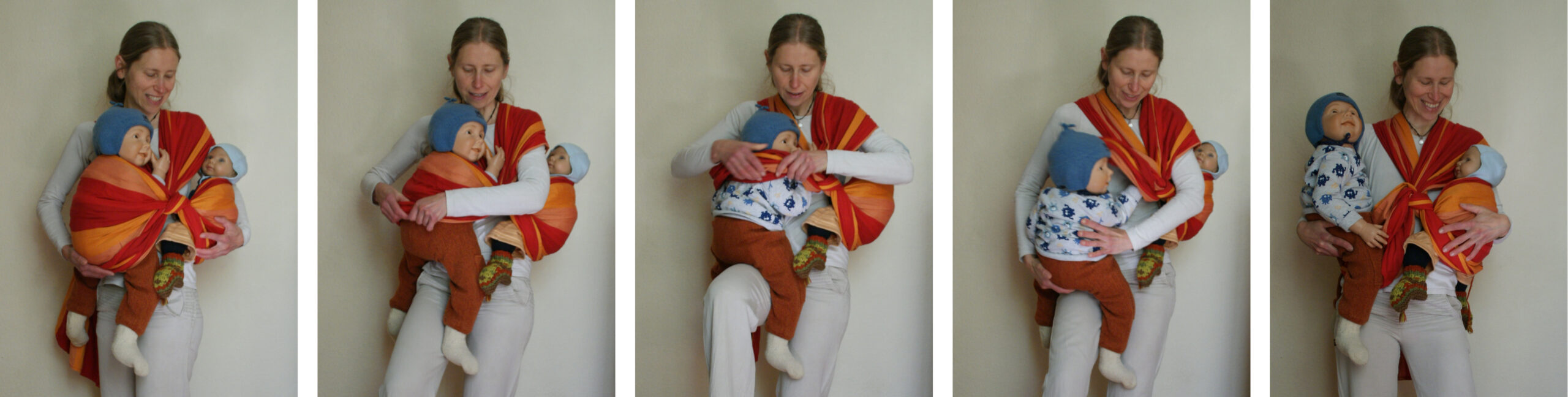 Vom Verstehen der Konstruktion bis zum sicheren Beherrschen des Einbindens beider Kinder auch ohne Hilfe von außen ist es unbedingt erforderlich zu üben: anfangs am besten mit Puppen und später, wenn statt der Puppen die Kinder in das Tragetuch einziehen, mit einem weiteren Erwachsenen, der mit Rat und Tat zur Seite steht.